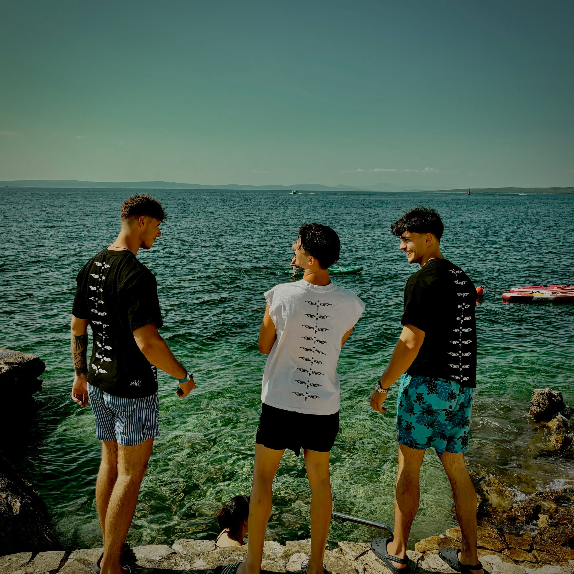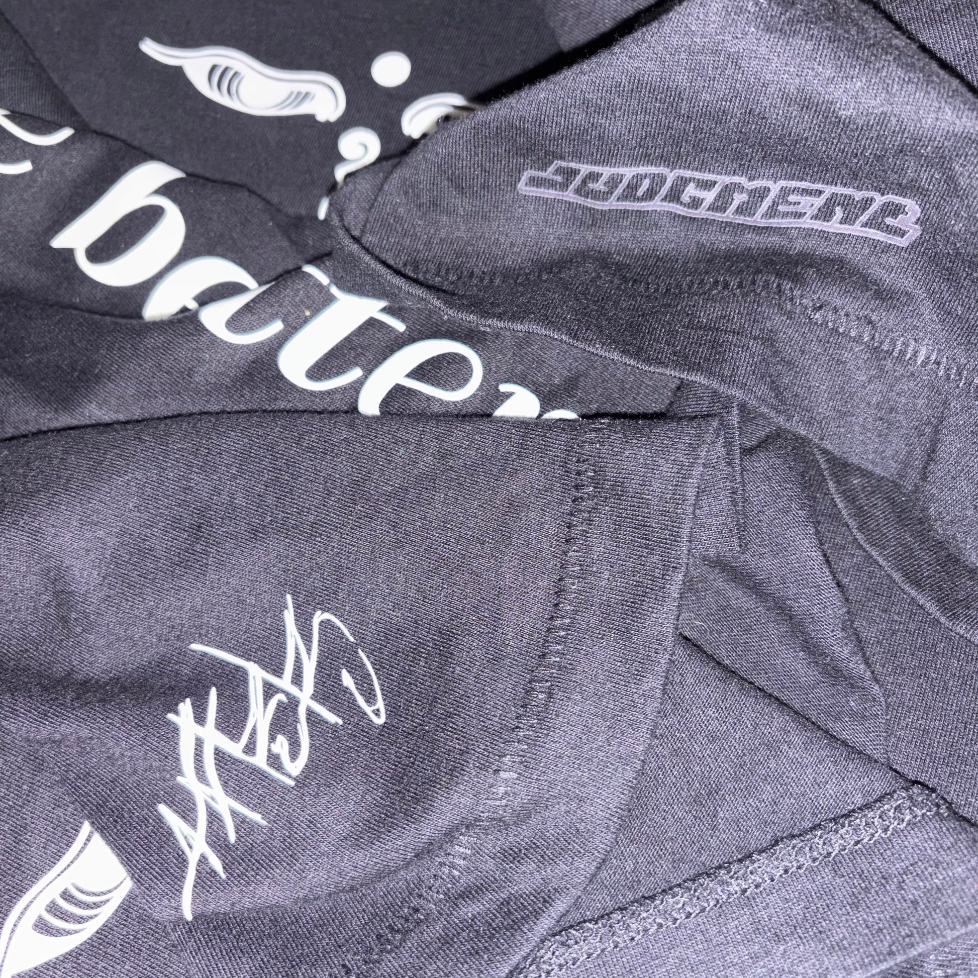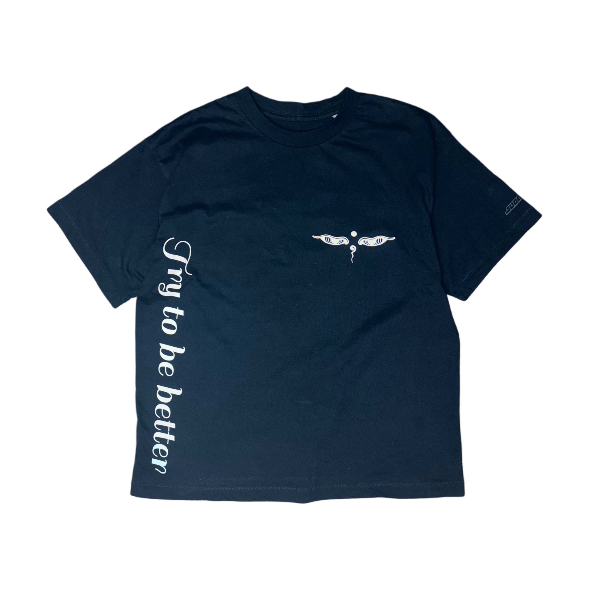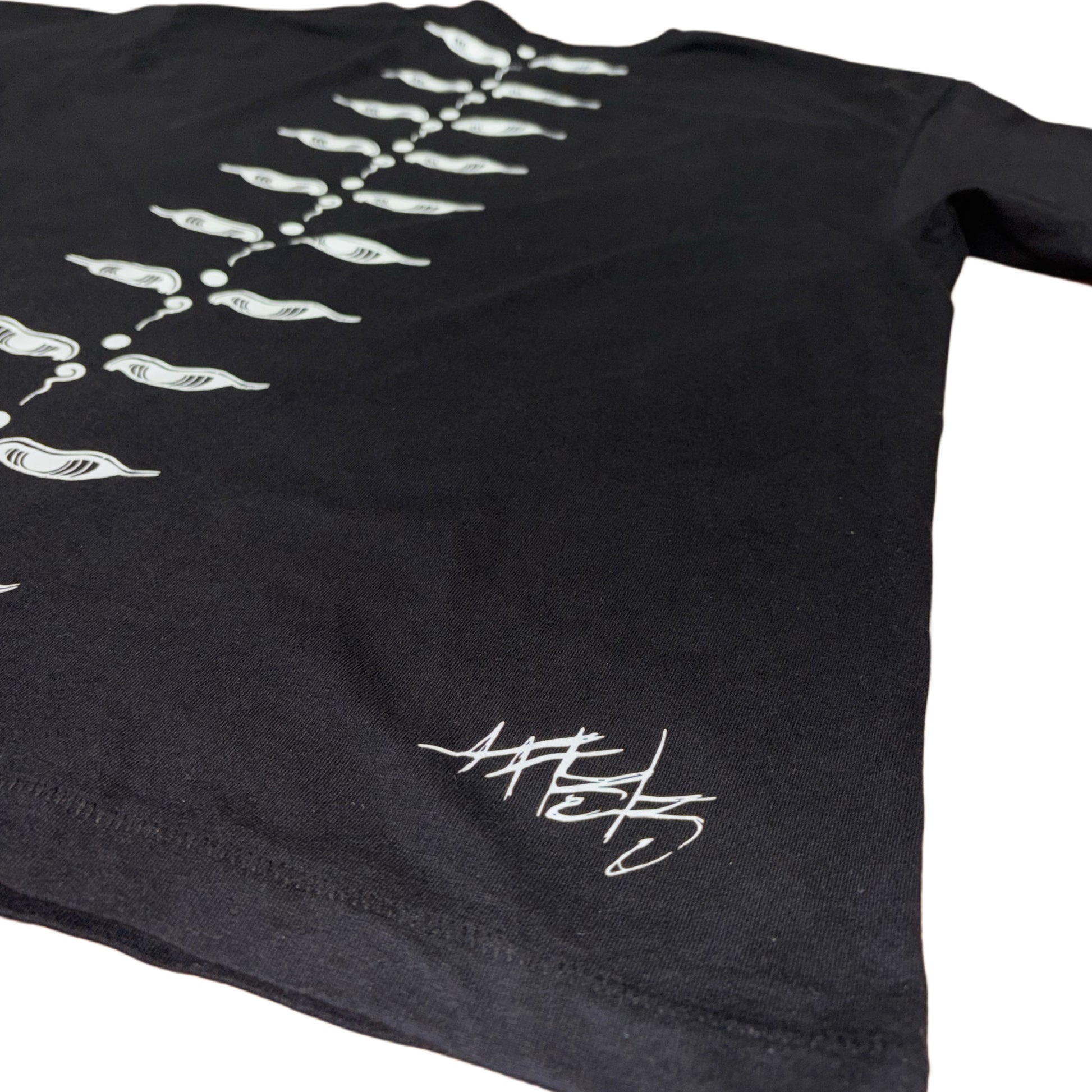 Maglia nera fatta da,50% cotone,50% cotone riciclato e con stampa DTF in bianco.